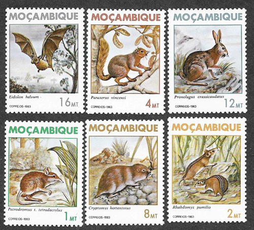 モザンビーク切手 1983年 小型哺乳類 ウサギ ストローオオコウモリ 6種