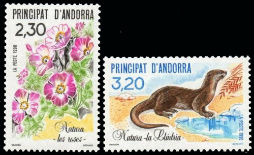 アンドラ切手 1990年 自然保護 ユーラシアカワウソ 花 2種
