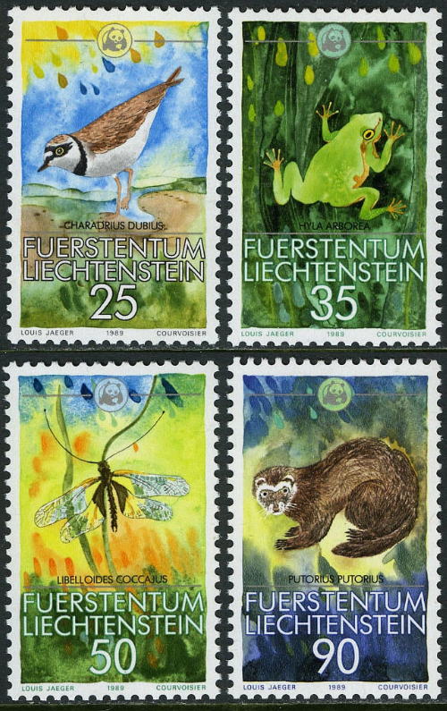 リヒテンシュタイン切手 1989年 世界自然保護基金 鳥 動物 コチドリ ヨーロッパケナガイタチ 4種