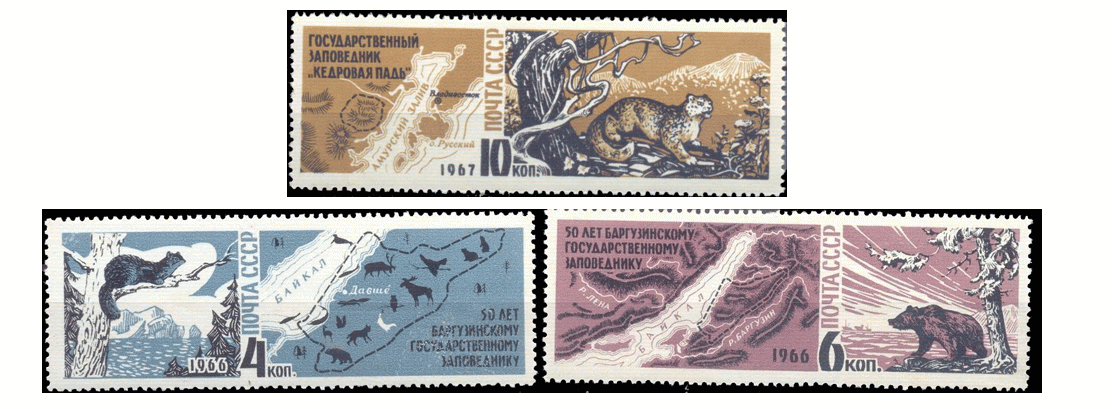 ロシア 旧ソ連切手 1966-67年 バルグジン自然保護区50周年 ユキヒョウ 3種