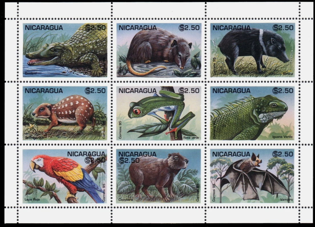ニカラグア切手 1985年 鳥 コンゴウインコ ローランドパカ カエル 9種